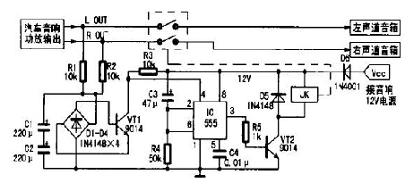 1.在接通音響電源的瞬間,因電容C3兩端電壓不能突變,可視為短路,則時(shí)基電路555的②、⑥腳電位高于2/3 Vcc,故555處于復(fù)位狀態(tài),③腳輸出低電平,晶體管VT2截止,繼電器JK常開(kāi)觸點(diǎn)不動(dòng)作。同時(shí)+12 V電壓通過(guò)電阻R4向電容C3充電,延時(shí)約5s(秒鐘)后555的②、⑥腳電位降低至1/3Vcc,555被觸發(fā)置位,③腳由低電平變?yōu)楦唠娖剑w管VT2導(dǎo)通,繼電器JK得電,常閉觸點(diǎn)閉合,從而實(shí)現(xiàn)了延遲一段時(shí)間將揚(yáng)聲器接入功放,徹底消除了開(kāi)機(jī)時(shí)大電流對(duì)揚(yáng)聲器的沖擊;
