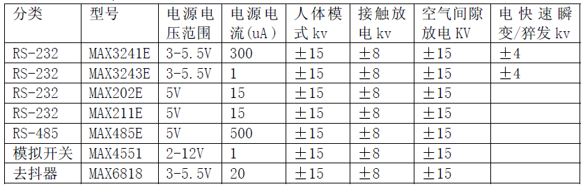 收的COM 端口需要8 個(gè)TransZorb?二極管費(fèi)用高達(dá)$2一種有效的方法是采用內(nèi)部集成ESD 防護(hù)功能的串行接口器件這種器件比普通無(wú)防護(hù)功能的器件價(jià)格要貴但增加的費(fèi)用比起外加防護(hù)二極管的費(fèi)用要低內(nèi)部集成的ESD,防護(hù)電路不會(huì)增加任何輸入輸出管腳的等效電容也節(jié)省了電路板面積MAXIM公司近幾年發(fā)展了享有專利的集成ESD防護(hù)技術(shù)并可提供全系列的ESD防護(hù)串行接口器件包括與標(biāo)準(zhǔn)器件完全兼容的產(chǎn)品MAXIM公司還將同樣的技術(shù)應(yīng)用到模擬開關(guān)和開關(guān)去抖產(chǎn)品中所有這些器件的ESD 防護(hù)能力都符合15kV IEC1000-4-2 氣隙放電8kVIEC1000-4-2 接觸放電15kV人體模型HBM 測(cè)試標(biāo)準(zhǔn)下表是MAXIM公司具有抗靜電功能的器件。