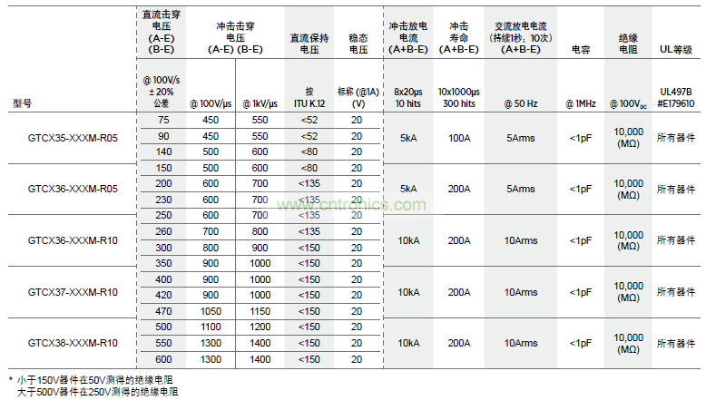 表 G3 兩電極高壓GDT器件額定電壓值、額定浪涌值、電容值、絕緣電阻值和安規(guī)認證