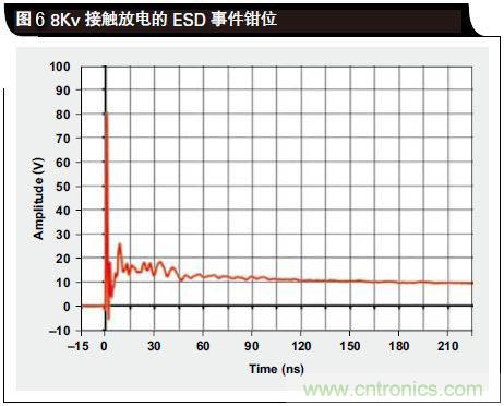 由于ESD是一種極速瞬態(tài)事件,I/O路線的電壓不能立即得到鉗制。如圖6所示,根據(jù)IEC 61000-4-2標準,數(shù)千伏電壓被鉗制為數(shù)十伏。如方程式1所示,RDYN越小,鉗位性能也就越好:其中,IPP為ESD事件期間的峰值脈沖電流,而Iparasitic為通過TVS接地來自連接器的線路寄生電感。