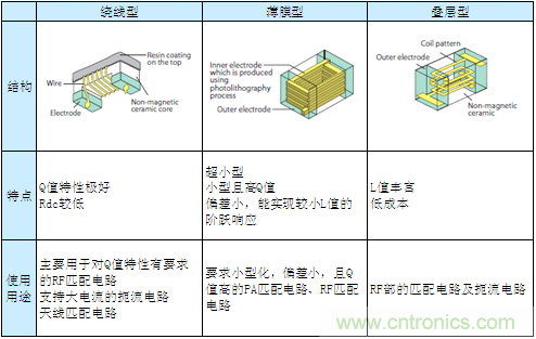 疊層型構(gòu)造雖有3種結(jié)構(gòu)且Q值也較低,但由于其L值偏差及規(guī)格、價格等整體的平衡性較好,因此被廣泛使用于RF的匹配電路、共振電路及扼流電路中?!?br /> 上述3種構(gòu)造各具特色,根據(jù)其特色其使用方法也各不相同。下講中,我們將介紹電感器的實際貼裝。