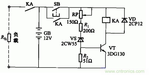 蓄電池深度放電,會使極板硫化,縮短蓄電池的使用壽命。為此可設(shè)置放電保護器。電路如圖所示。當(dāng)蓄電池電壓下降到終止值(可由電位器RP來改變動作閾值),繼電器KA釋放,切斷負(fù)載回路,使蓄電池停止放電。