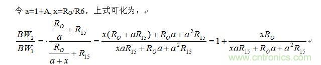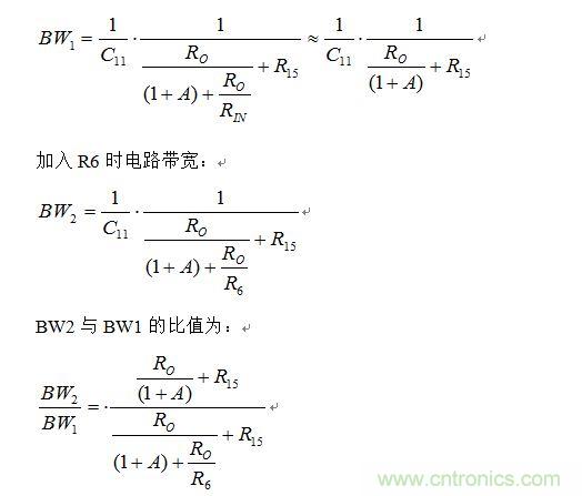 從上式看出,當(dāng)A較小時,R6的加入確實有擴展帶寬的作用,但R6的取值不能太大。當(dāng)R6取得很大時,x=R0/R6趨近于0,BW2/BW1趨近于1,也就不能擴展帶寬了。