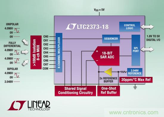 【導(dǎo)讀】近日,凌力爾特公司宣布推出具排序器的 18 位、1Msps、8 通道的逐次逼近寄存器 ADC LTC2373-18,該器件擁有卓越的 100dB SNR 性能。LTC2373-18 具可編程排序器,可存儲多達(dá) 16 個(gè)控制字,以配置多工器 (MUX) 和輸入范圍。