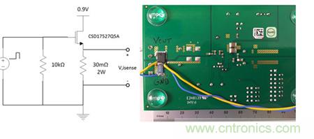 大多數(shù)電源評估模塊可以很容易地被配置為快速汲入電流的模式。圖1舉例說明了分立金屬氧化物半導體場效應晶體管(MOSFET)加可直接從輸出平面焊接到接地裝置的檢測電阻器電路。選擇快速切換的低柵極電荷MOSFET以及能處理負載功率的低電感檢測電阻器至關重要。
