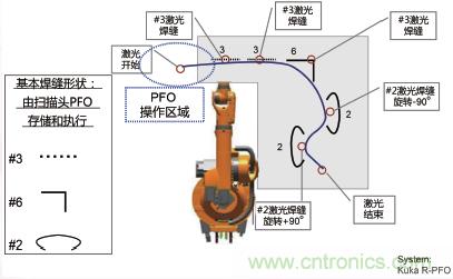 除了激光拼焊,激光飛行焊也已經(jīng)被廣泛應(yīng)用于汽車車身及其他零部件的焊接。激光飛行焊是將振鏡焊接頭與機(jī)器人的運(yùn)動(dòng)結(jié)合起來(lái),實(shí)現(xiàn)高效靈活的激光焊接。振鏡(PFO)及飛行焊的原理見圖4、5、6。其中PFO可以通過兩片鏡片的旋轉(zhuǎn),實(shí)現(xiàn)激光焦點(diǎn)在工件上的快速靈活移動(dòng)和定位,可以大大提供激光焊接時(shí)的動(dòng)態(tài)性能,更加高效。而機(jī)器人則可以擴(kuò)展焊接范圍,以實(shí)現(xiàn)更大零件的焊接。兩者的結(jié)合,則可以實(shí)現(xiàn)優(yōu)勢(shì)互補(bǔ),達(dá)到高效、靈活、低成本的激光焊接。