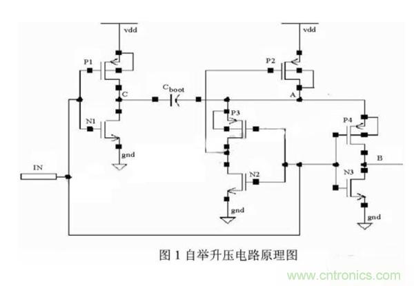 自舉升壓電路的原理圖如圖1所示。所謂的自舉升壓原理就是,在輸入端IN輸入一個方波信號,利用電容Cboot將A點電壓抬升至高于VDD的電平,這樣就可以在B端輸出一個與輸入信號反相,且高電平高于VDD的方波信號。具體工作原理如下: