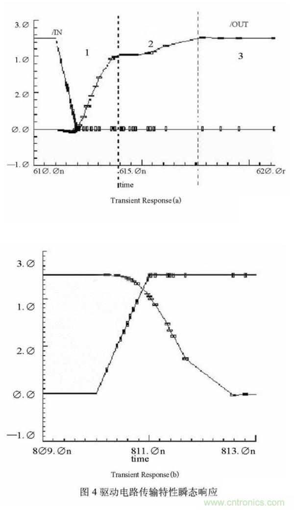 驅(qū)動電路的傳輸特性瞬態(tài)響應(yīng)在圖4中給出。其中(a)為上升沿瞬態(tài)響應(yīng),(b)為下降沿瞬態(tài)響應(yīng)。從圖4中可以看出,驅(qū)動電路上升沿明顯分為了三個部分,分別對應(yīng)三個上拉驅(qū)動管起主導(dǎo)作用的時期。1階段為Q1、N4共同作用,輸出電壓迅速抬升,2階段為N4起主導(dǎo)作,使輸出電平達(dá)到VDD,3階段為P5起主導(dǎo)作用,維持輸出高電平為VDD。而且還可以縮短上升時間,下降時間滿足工作頻率在兆赫茲級以上的要求。