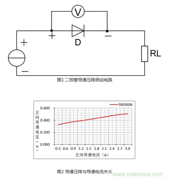 在二極管兩端加正向偏置電壓時,其內(nèi)部電場區(qū)域變窄,可以有較大的正向擴散電流通過PN結(jié)。只有當(dāng)正向電壓達到某一數(shù)值(這一數(shù)值稱為“門檻電壓”,鍺管約為0.2V,硅管約為0.6V)以后,二極管才能真正導(dǎo)通。但二極管的導(dǎo)通壓降是恒定不變的嗎?它與正向擴散電流又存在什么樣的關(guān)系?通過下圖1的測試電路在常溫下對型號為SM360A的二極管進行導(dǎo)通電流與導(dǎo)通壓降的關(guān)系測試,可得到如圖2所示的曲線關(guān)系:正向?qū)▔航蹬c導(dǎo)通電流成正比,其浮動壓差為0.2V。從輕載導(dǎo)通電流到額定導(dǎo)通電流的壓差雖僅為0.2V,但對于功率二極管來說它不僅影響效率也影響二極管的溫升,所以在價格條件允許下,盡量選擇導(dǎo)通壓降小、額定工作電流較實際電流高一倍的二極管。