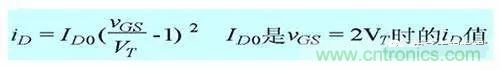 在轉(zhuǎn)移特性曲線上,gm 是曲線在某點上的斜率,也可由iD的表達(dá)式求導(dǎo)得出,單位為 S 或 mS。