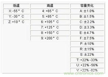 對(duì)于其他的編碼與溫度特性的關(guān)系,大家可以參考表4-1。例如,X5R的意思就是該電容的正常工作溫度為-55°C~+85°C,對(duì)應(yīng)的電容容量變化為±15%