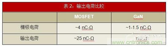 • 較低的柵極和輸出電荷:GaN提供較低的柵極電荷。與MOSFET的4nC相比,典型的中壓器件具有大約1nC的柵極電荷(表2)。較低的柵極電荷使設計具有更快的導通時間和轉(zhuǎn)換速率,同時減少損耗。