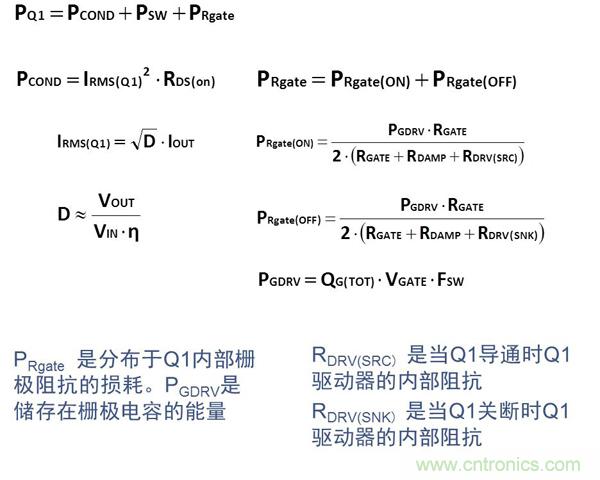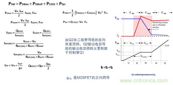 對于高頻應(yīng)用(>MHz),控制管Q1的選用應(yīng)針對降低開關(guān)損耗進(jìn)行優(yōu)化。Q1損耗的計算公式如下:
