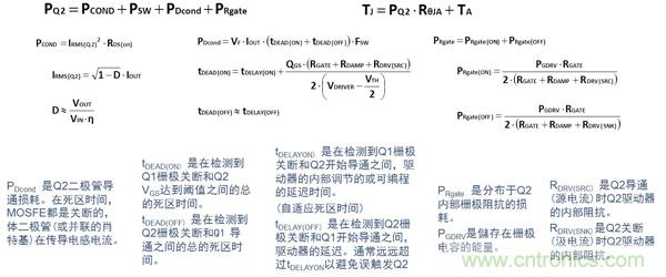 Q1工作在硬開關(guān)條件下,在小占空比或高頻(> MHz)時以開關(guān)損耗為主,開關(guān)性能受同步管Q2影響:快速di/dt可導(dǎo)致反向恢復(fù)損耗增加,快速dv/dt有可能引起Q2誤導(dǎo)通, 造成Q1、Q2直通現(xiàn)象,導(dǎo)致額外的損耗。另外,值得注意的是,由Q2體二極管導(dǎo)致的反向恢復(fù)損耗、 Q2輸出電容導(dǎo)致的輸出電容損耗主要耗散于控制管Q1上 [Ref. 1,2]。因此,在計算Q1的開關(guān)損耗和溫度時必須綜合考慮到Q2的影響。另外,Q1的導(dǎo)通阻抗隨結(jié)溫上升而上升。結(jié)溫越高,導(dǎo)通阻抗越高,導(dǎo)通損耗就越高, 使得結(jié)溫進(jìn)一步上升。因此,對Q1的導(dǎo)通損耗必須循環(huán)反復(fù)計算,直到管子的溫度計算結(jié)果穩(wěn)定下來。