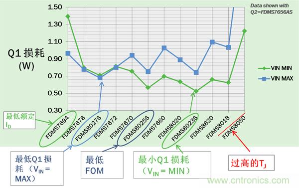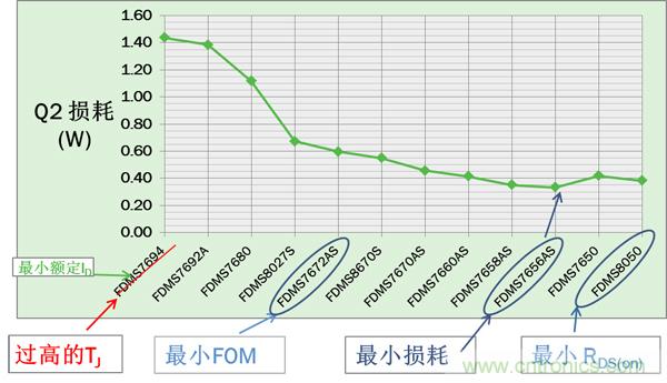 對于Q2,VIN= VINMAX時損耗最大。圖3所示的12個器件中,F(xiàn)DMS7656AS有最低的最大損耗。但由于Q2 寄生參數(shù)會影響Q1的 開關(guān)損耗, 最小Q2 損耗通常并不意味著最佳的總能效。必須比較Q1及Q2的總功耗來找到最佳的Q2以實現(xiàn)最高能效。