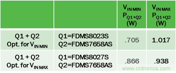 為優(yōu)化轉(zhuǎn)換器能效,首先根據(jù)VIN選擇損耗最小的Q1,然后選擇產(chǎn)生損耗最小的Q2。本例中, 無論VIN最小或最大,最佳的Q2是相同的,都為FDMS7658AS(但并不總是如此,特別是具有寬VIN范圍或高FSW時)。