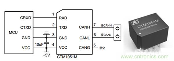 圖2.隔離型CAN收發(fā)模塊及應(yīng)用電路