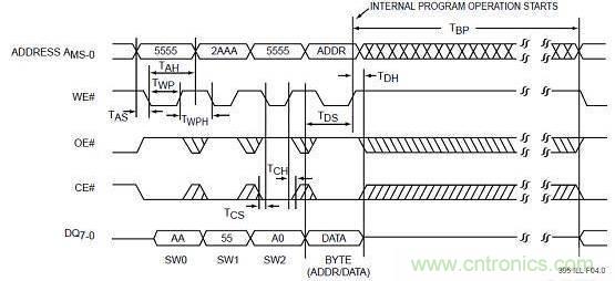 從圖中我們可以看出ADDRESS是表示地址總線的,DQ是表示數(shù)據(jù)總線的,CE是片選信號(hào),且是低電平有效,其寬度要保證在進(jìn)行讀操作時(shí)總是有效的。學(xué)會(huì)看時(shí)序圖對(duì)于做嵌入式系統(tǒng)開發(fā)非常有幫助,因?yàn)槲覀儾豢杀苊獾囊c芯片打交道。在時(shí)序圖中,通常會(huì)標(biāo)識(shí)很多的時(shí)間需求信息。在寫啟動(dòng)代碼時(shí)需要初始化各地址空間的片選地址寄存器和讀寫時(shí)序,時(shí)序的配置依據(jù)就是來自于外設(shè)芯片的時(shí)間需求,這是芯片手冊(cè)很重要的一部分內(nèi)容。當(dāng)一個(gè)地址空間中存在多個(gè)外設(shè)芯片時(shí),我們需要考慮到其中最慢的外設(shè)芯片的時(shí)間需求,否則的話有的芯片就不能正常工作。