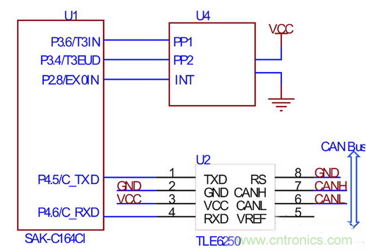 C164CI 與方向盤轉(zhuǎn)角傳感器的接口電路如圖2所示。片內(nèi)內(nèi)置增量編碼的正交解碼器,該解碼器使用定時器3的兩個引腳(T3IN、T3EUD)作為正交脈沖的輸入,在正確設(shè)置相關(guān)寄存器后,定時器3的數(shù)據(jù)寄存器的值與方向盤轉(zhuǎn)角成正比,故可方便的計算轉(zhuǎn)角,本文所使用的方向盤轉(zhuǎn)角傳感器每一圈對應(yīng)44個脈沖,設(shè)定時器3的數(shù)據(jù)寄存器為T3,則絕對轉(zhuǎn)角為。