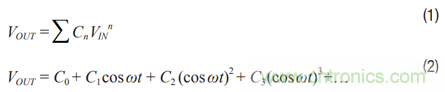 差分信號(hào)可抑制偶數(shù)階諧波。以下展示了連續(xù)波(CW)通過一個(gè) 增益模塊的示例。當(dāng)使用一個(gè)單端放大器時(shí),如圖2所示,輸出 可表示為公式1和公式2。