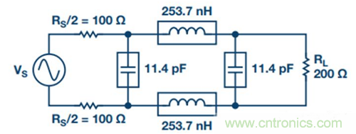 2. 將單端濾波器變?yōu)椴罘譃V波器。源阻抗和負(fù)載阻抗保持不變,所有電容并聯(lián),所有串聯(lián)電感減半并放在另一差分路徑中(參見圖17)。