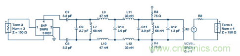 4. 對(duì)于子系統(tǒng)級(jí)仿真,應(yīng)在輸入端增加ADL5201 DGA S參數(shù)文件,并使用壓控電壓源來模擬濾波器輸出端的 AD6641 ADC。為將低通濾波器變?yōu)閹V波器,增加兩個(gè)分流電感:L7與C9并聯(lián),L8與C11并聯(lián)。C12代表AD6641輸入電容。R3和R4是放在AD6641輸入端的兩個(gè)負(fù)載電阻,用作濾波器的負(fù)載。AD6641輸入為高阻抗。調(diào)諧后的情況參見圖19。