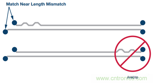 成對(duì)差分走線的長度須相同。此規(guī)則源自這一事實(shí):差分接收器檢測(cè)正負(fù)信號(hào)跨過彼此的點(diǎn),即交越點(diǎn)。因此,信號(hào)須同時(shí)到達(dá)接收器才能正常工作。