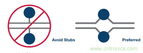 差分對(duì)布線時(shí),應(yīng)使用對(duì)稱布線(參見圖24)。若需要測(cè)試點(diǎn), 應(yīng)避免引入走線分支,而且測(cè)試點(diǎn)應(yīng)對(duì)稱放置(參見圖25)。