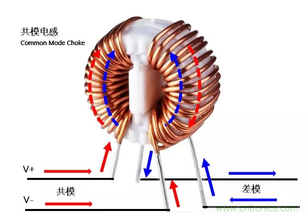 當(dāng)有共模成分流過共模電感時,根據(jù)右手定則,會在兩個線圈形成方向相同的磁場,相互加強,相當(dāng)于對共模信號存在較高的感抗;