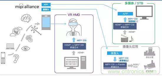 例如VR技術(shù),VR是使用高清晰的小型顯示設(shè)備,其實(shí)這是從原來的智能手機(jī)顯示屏發(fā)展而來。智能手機(jī)主要使用MIPI等接口方式,但是VR是從PC轉(zhuǎn)變來的,它采用了大量高清晰度圖像。主要使用HDMI接口。隨著手機(jī)進(jìn)入到VR領(lǐng)域,就會(huì)遇到接口不統(tǒng)一的挑戰(zhàn)。