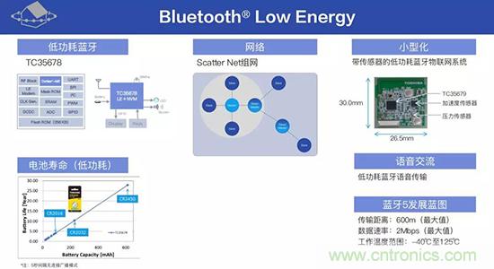 針對這樣的應(yīng)用場景,東芝推出了整合了控制芯片的藍(lán)牙芯片,是迄今實(shí)現(xiàn)的功耗最低藍(lán)牙芯片,新的藍(lán)牙芯片可以實(shí)現(xiàn)組網(wǎng),可應(yīng)用到體積很小的設(shè)備上,且可以通過新版本,實(shí)現(xiàn)長達(dá)600米通信距離,最大電流是3.3毫安,一顆鈕扣電池可以使用3到4年。
