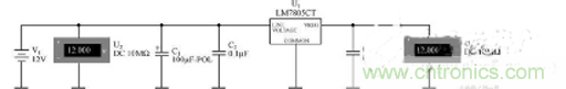 對圖2 所示的電路進行仿真,其中電容C1、C2、C3的容量分別為100μF、0.1μF、0.1μF,輸入+12V的直流信號,使用兩個電壓表來觀察輸入/輸出的結(jié)果。