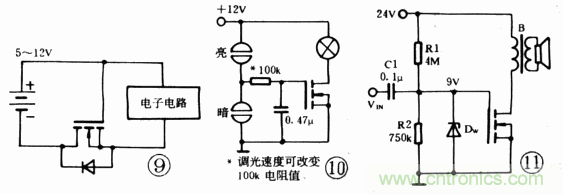 一種簡單的觸摸調(diào)光電路如圖10。當(dāng)手指觸摸上觸頭時,電容經(jīng)手指電阻及100k充電,VGS漸增大,燈漸亮;當(dāng)觸摸下觸頭時,電容經(jīng)
