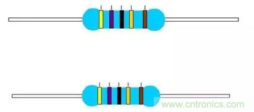 技巧2:棕色環(huán)是否是誤差標(biāo)志的判別。棕色環(huán)既常用做誤差環(huán),又常作為有效數(shù)字環(huán)。常常在第一環(huán)和最末一環(huán)中同時(shí)出現(xiàn),使人很難識(shí)別誰(shuí)是第一環(huán)。在實(shí)踐中可以 按照色環(huán)之間的間隔加以判別。比如對(duì)于一個(gè)五道色環(huán)的電阻而言,第五環(huán)和第四環(huán)之間的間隔比第一環(huán)和第二環(huán)之間的間隔要寬一些,據(jù)此可判定色環(huán)的排列順序。
