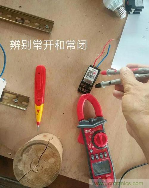 中間繼電器的每一組控制觸點(diǎn)分為公共端,常閉點(diǎn)和常開點(diǎn)。和線圈進(jìn)線端一個方向的是觸點(diǎn)公共端,出線端分常開和常閉。判斷常開和常閉的方法是把繼電器插上繼電器座,用萬用表的通斷檔分別測量公共端到兩個出線端的通斷,通的是常閉,不通的是常開。如果沒有萬用表,我這里有一個小經(jīng)驗(yàn)告訴大家,一般中間繼電器的觸點(diǎn)都是上開下閉,就是上面一排是常開點(diǎn),下面一排是常閉點(diǎn)。大家可以參考一下。后面有圖。