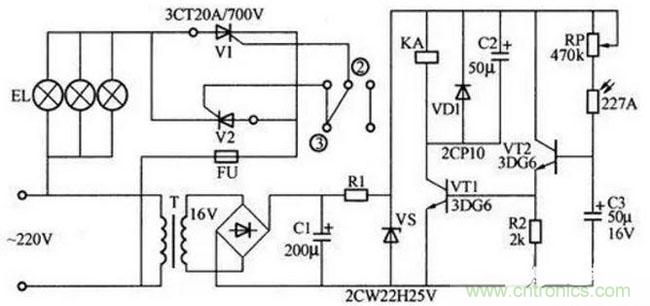 白天在較強光照下,光導(dǎo)管227A(一種光敏電阻)兩端阻值很小,約20~50kΩ,晶體管VT2獲得基極電流而導(dǎo)通,VT1從R2上得到正偏電壓也導(dǎo)通,繼電器線圈KA得電,繼電器的常閉觸電②、③斷開,兩只晶閘管V1和V2沒有觸發(fā)信號而不導(dǎo)通,因而燈泡EL不亮。