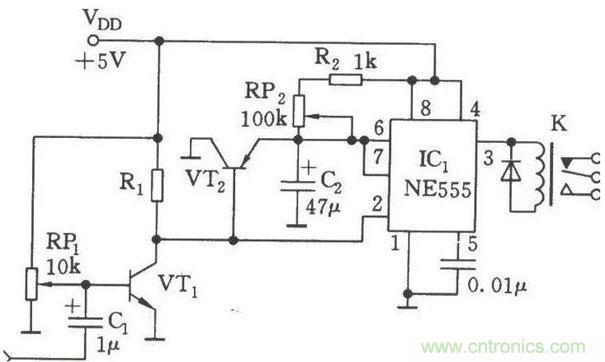 繼電器開關(guān)電路圖(一):延遲吸合繼電器開關(guān)控制電路圖