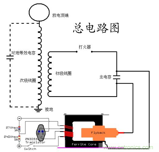 SGTC的原理就是先給電容充電,電容的電壓達到一定程度時,在打火器出放出電弧,形成一個回路,然后放電,之后重新開始這個循環(huán)。