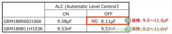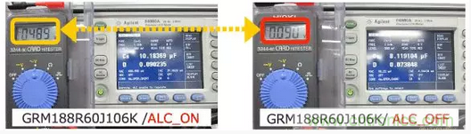 大容量和非大容量MLCC在ALC (Automatic Level Control )ON/OFF的狀態(tài)下測定靜電容量。結(jié)果如下。