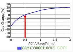 測定條件20℃、1KHz時(shí)的MLCC的AC電壓特性如下圖所示。