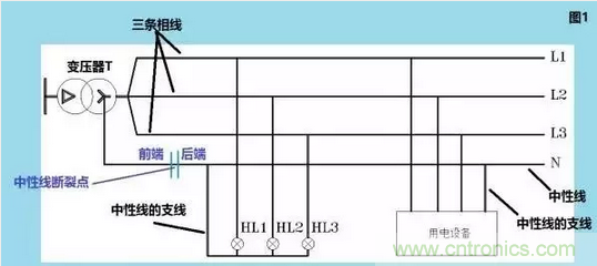 我們再來看圖1。圖1中的中性線發(fā)生了斷裂,于是在斷裂點(diǎn)的前方,中性線的電壓依舊為零,但斷裂點(diǎn)的后方若三相平衡時(shí),它的電壓為零;但若三相不平衡,則斷裂點(diǎn)后方的中性線電壓會上升,最高會升到相電壓。