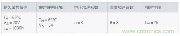 在此,我們一起來(lái)比較一下陶瓷電容器的加速試驗(yàn)與實(shí)際產(chǎn)品使用的假定環(huán)境。我們將電容器的加速試驗(yàn)中將耐久試驗(yàn)時(shí)間視為L(zhǎng)A,將實(shí)際使用環(huán)境下的相當(dāng)年數(shù)視為L(zhǎng)N,用于上述公式。