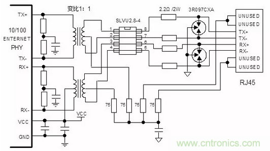 注意,TVS管的寄生電容可能影響信號完整性,可以使用壓敏電阻放在變壓器抽頭,作為防護電路,支持更高速率的網(wǎng)口設(shè)計。