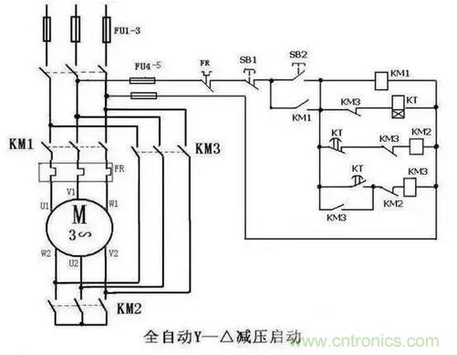 帶延時繼電器的星三角更加方便,接線和上圖的手動控制類似,只不過把按鈕開關換成了延時繼電器。按鈕開關SB2按下去以后KM1自鎖,同時延時繼電器的線圈得電啟動,延時繼電器KT常閉點串KM2線圈,KT常開點串KM3線圈,延時時間到了以后KM3自鎖。KM3的輔助常閉點串延時繼電器的線圈,所以啟動完成后,延時繼電器也會斷電。