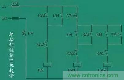 這個電路沒有太大的實用性,但是非常適合學習。2個中間繼電器和一個交流接觸器,我們看一下電路,2個繼電器互鎖,KA1的線圈串KM的輔助常閉點,KA2的線圈串KM的輔助常開點。所以按下SB按鈕開關KA1自鎖,同時KA1的常開點閉合KM自鎖,實現(xiàn)了啟動操作。然后再按下SB按鈕開關,KA2又會自鎖,KA2的常閉點會斷開,而KA2的常閉點是串的KM的線圈,所以同時KM線圈失電,實現(xiàn)停止操作。