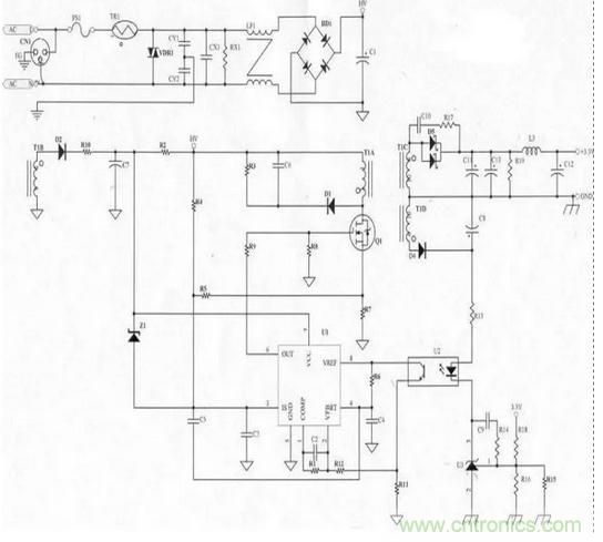 主要用于調(diào)整PWM IC的VCC電壓,以目前使用的3843而言,設(shè)計(jì)時(shí)VCC必須大于8.4V(Min. Load時(shí)),但為考慮輸出短路的情況,VCC電壓不可設(shè)計(jì)的太高,以免當(dāng)輸出短路時(shí)不保護(hù)(或輸入瓦數(shù)過(guò)大)。