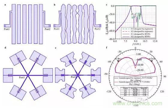 圖6:AI與人類專業(yè)工程師設(shè)計(jì)對比。a)由工程師設(shè)計(jì)的濾波器模型。b)由AI設(shè)計(jì)的濾波器模型。c)a 的回波損耗曲線(S11)和插入損耗曲線(S21),以及b 的回波損耗曲線(S11)和插入損耗曲線(S21)。d)由工程師設(shè)計(jì)的貼片天線模型。e)由AI設(shè)計(jì)的貼片天線模型。f)a 和b 的7.35 GHz 增益曲線。