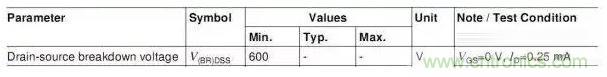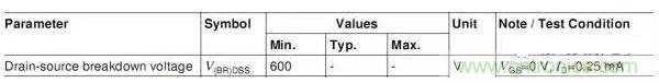 這個(gè)參數(shù)是有條件的,這個(gè)最小值600V是在Tj=25℃的值,也就是只有在Tj=25℃時(shí),MOSFET上電壓不超過600V才算是工作在安全狀態(tài)。