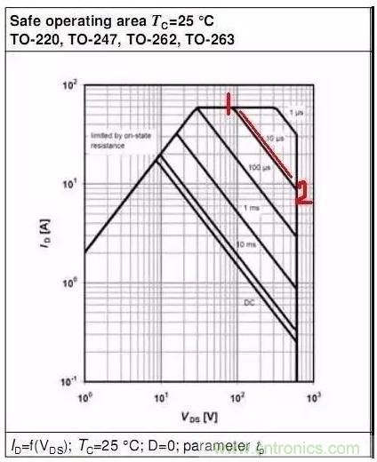 此圖中:當(dāng)VDS=1V時(shí),Y軸對(duì)應(yīng)的ID為2A,Rds=VDS/ID=0.5R ==>Tj=150℃時(shí),Rds(on)約為0.5R.當(dāng)VDS=10V時(shí),Y軸對(duì)應(yīng)的ID為20A,Rds=VDS/ID=0.5R ==>Tj=150℃時(shí),Rds(on)約為0.5R.所以,此部分曲線中,SOA表現(xiàn)為Tj_max時(shí)RDS(on)的限制.
