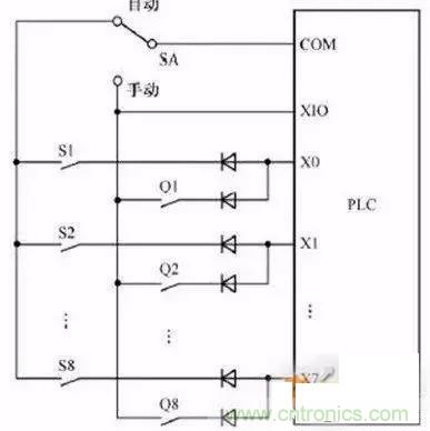 如圖上系統(tǒng)分自動和手動兩種工作方式,Q1-Q8為手動方式用到的 輸入信號,S1-S8為自動方式用到的輸入信號。S1和Q1共用輸入點X0,PLC運行時只會用到其中一組信號,所以可以共用PLC的輸入點。(圖中二極管是用來防止寄生回路,避免錯誤輸入信號的產(chǎn)生。